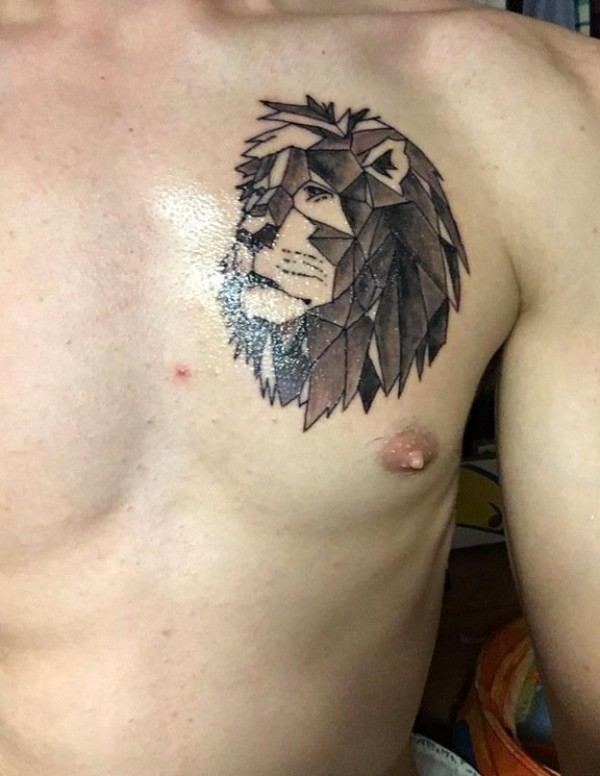 男性左侧胸部上的帅气黑灰色几何风格狮子纹身