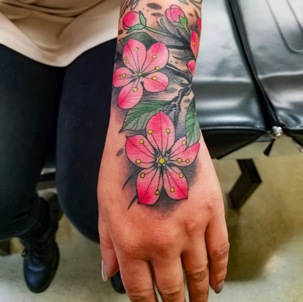 手腕上彩色樱花纹身植物颜料纹身图片