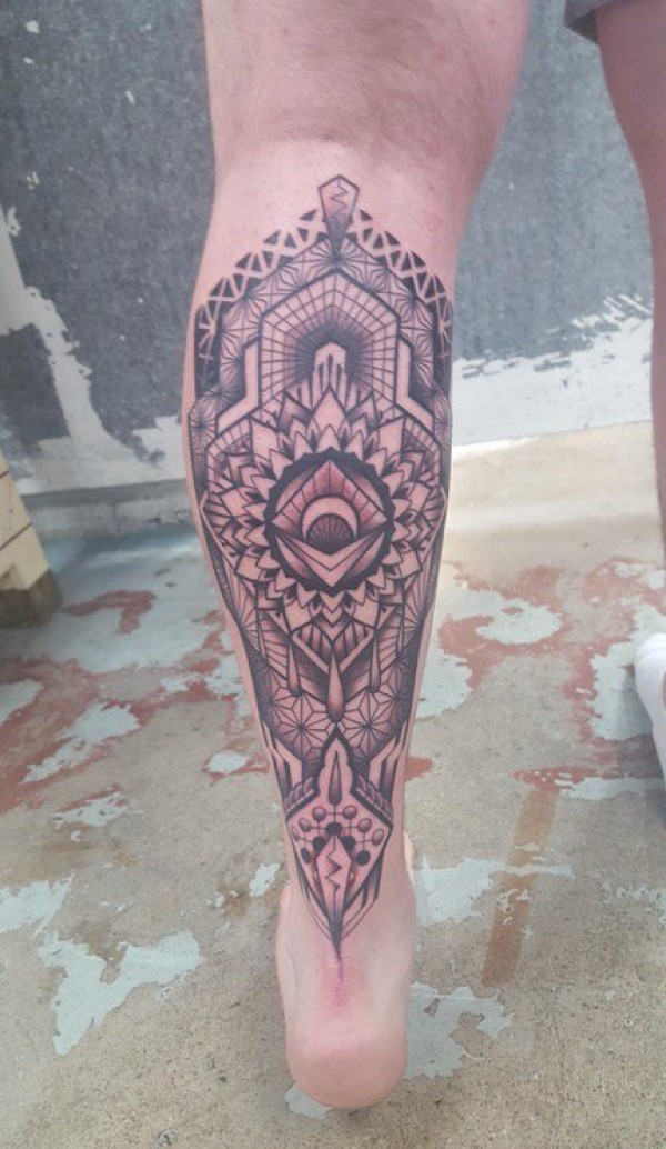 小腿上的黑色密集的几何曼陀罗纹身图片