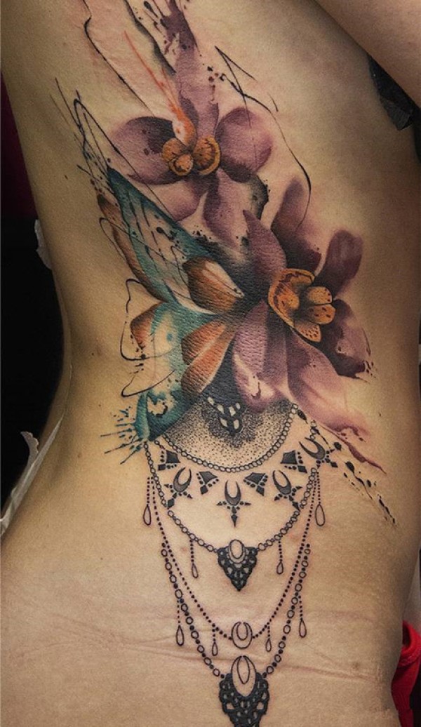 侧腰唯美水彩兰花蝴蝶和点刺挂饰纹身图案