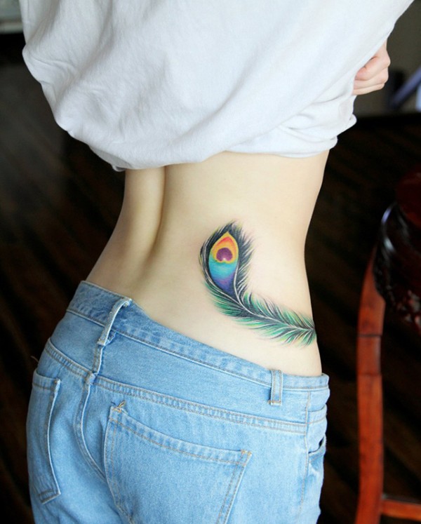 女生腰部梦幻的彩色孔雀羽翎个性纹身图案