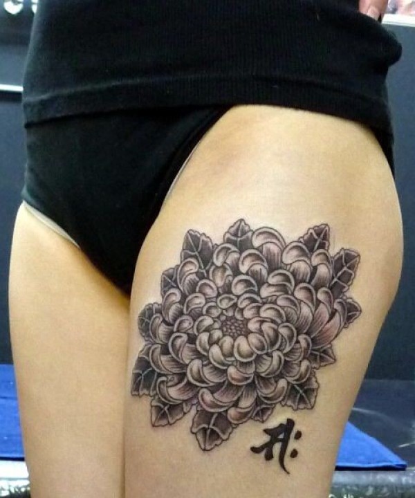 性感美女大腿上菊花和汉字纹身图案
