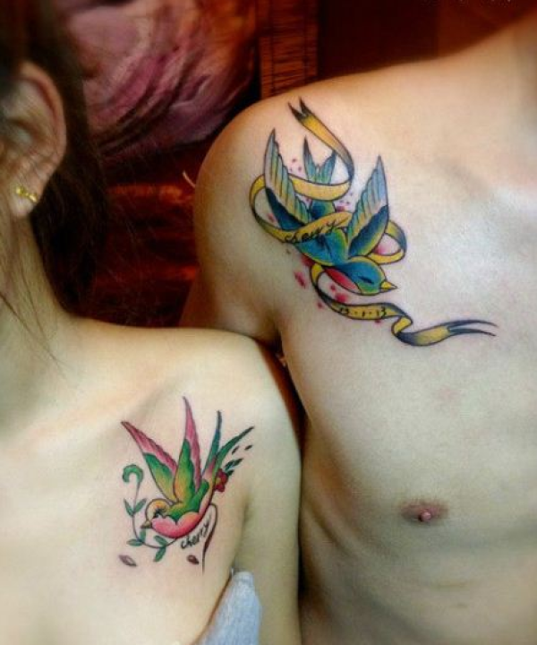 情侣肩部流行精美的小燕子纹身图案