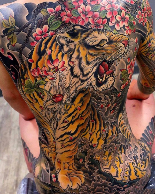 满背霸气咆哮的老虎花蕊彩绘纹身图案