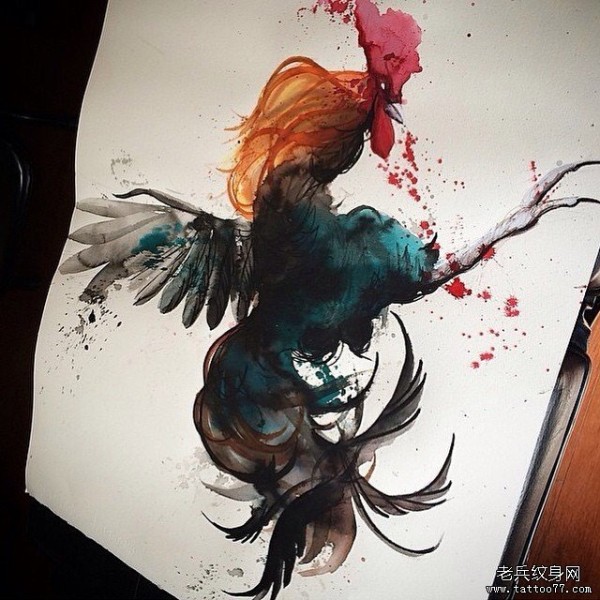 欧美school写实公鸡泼墨彩绘纹身图案手稿