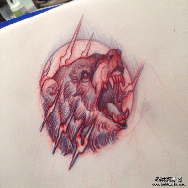 欧美school熊头闪电纹身图案手稿