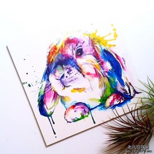 欧美school泼墨彩绘可爱的兔子纹身图案手稿