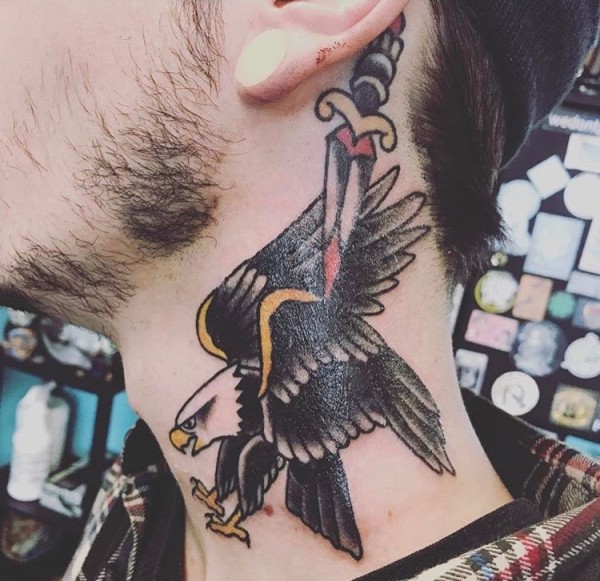男人脖子彩色燕子刺青图案图片_脖子纹身图案大全_纹身图吧
