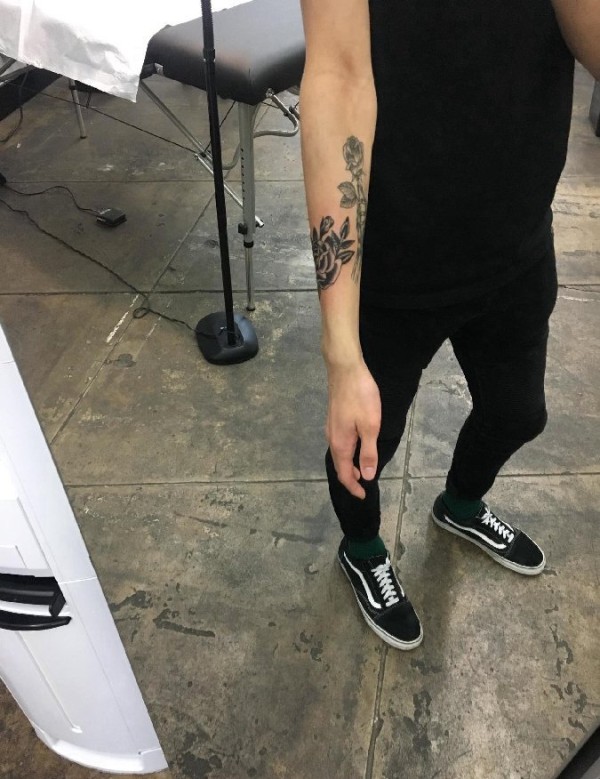 男子右手前臂上精致的黑色玫瑰花纹身图片