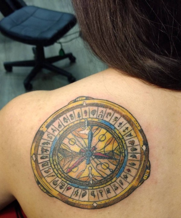 女性背上漂亮的黄金罗盘纹身图片