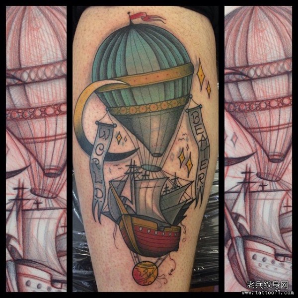 欧美大腿热气球帆船组合纹身图案