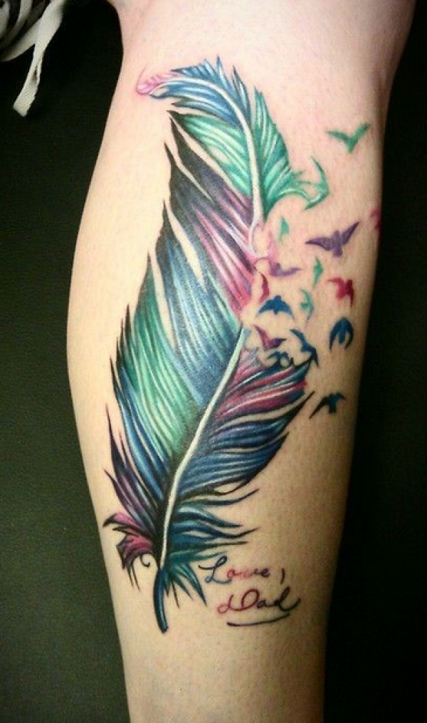 小腿彩色代表纯洁的羽毛纹身图案