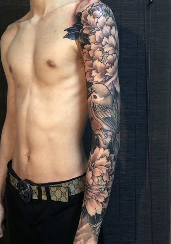 手臂好看的牡丹花与小鸟纹身图案
