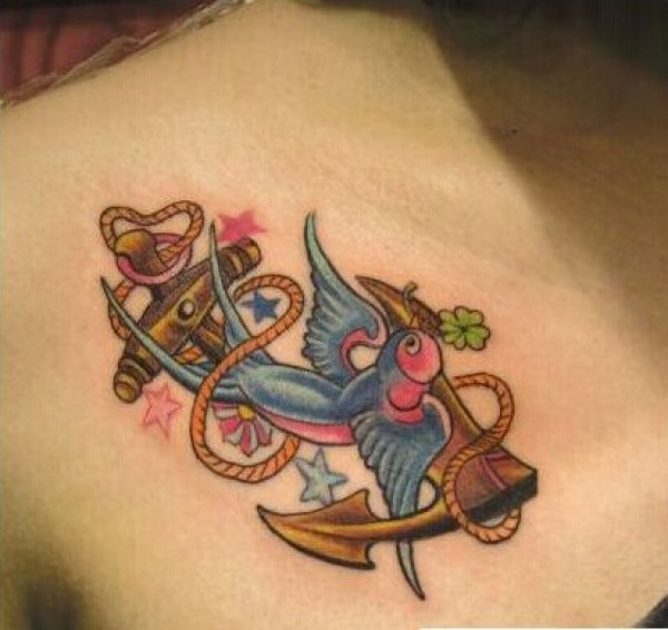 女生胸部漂亮小燕子与船锚纹身图案