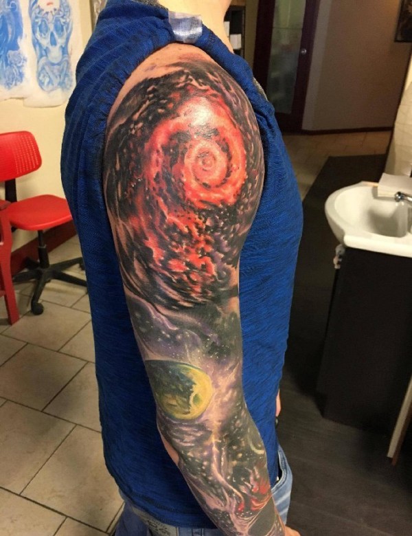 彩色时尚花臂纹身小宇宙纹身星球纹身图片