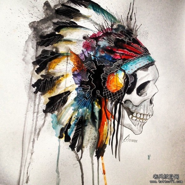 欧美彩绘泼墨印第安骷髅纹身图案手稿