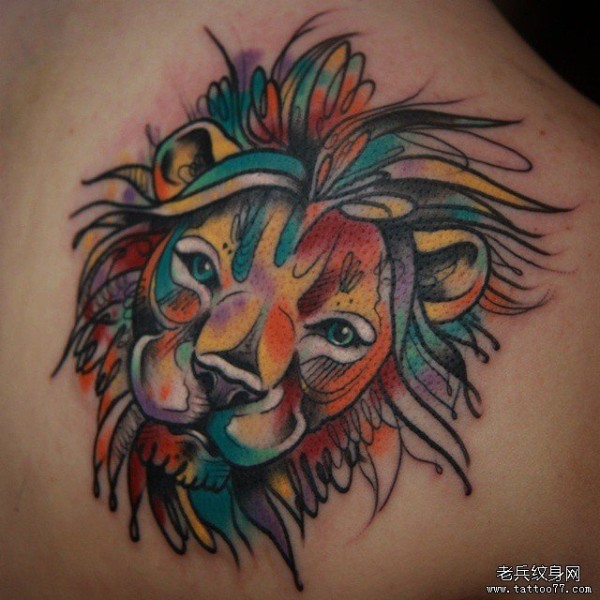 背部欧美泼墨水彩狮子纹身图案