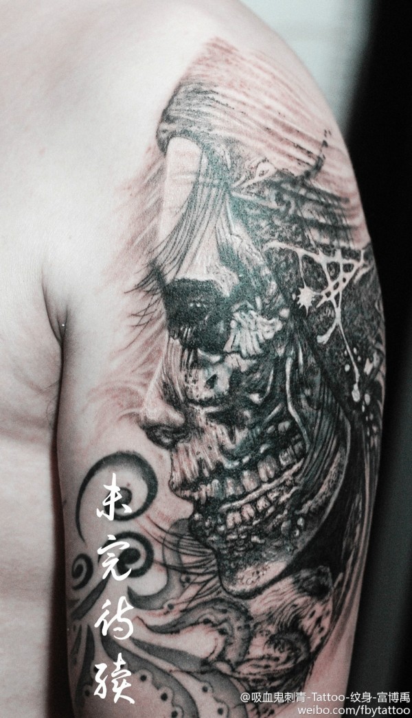 遮盖之前的龙纹身.新作中采用水墨烘托整体