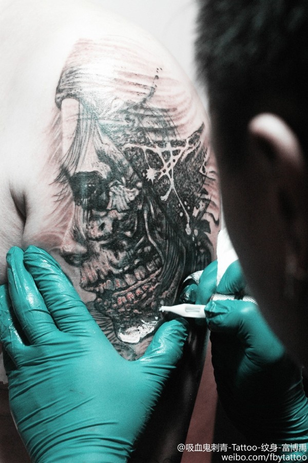遮盖之前的龙纹身.新作中采用水墨烘托整体