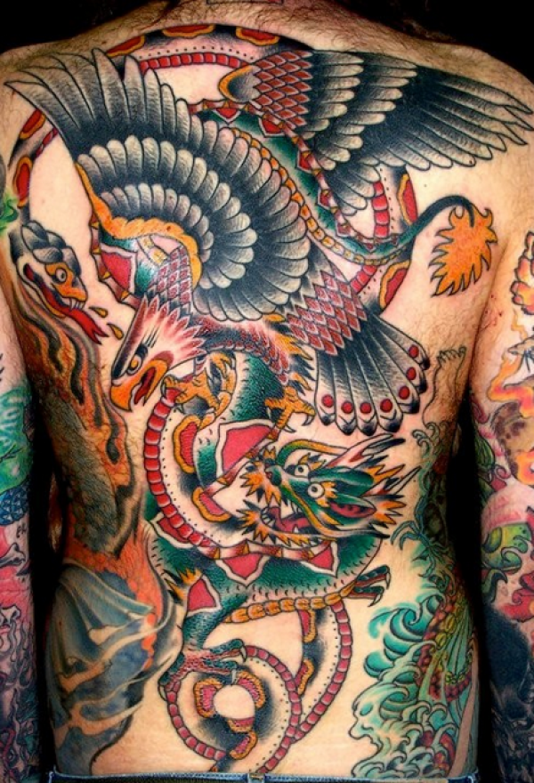 满背old school龙蛇鹰大战纹身图案
