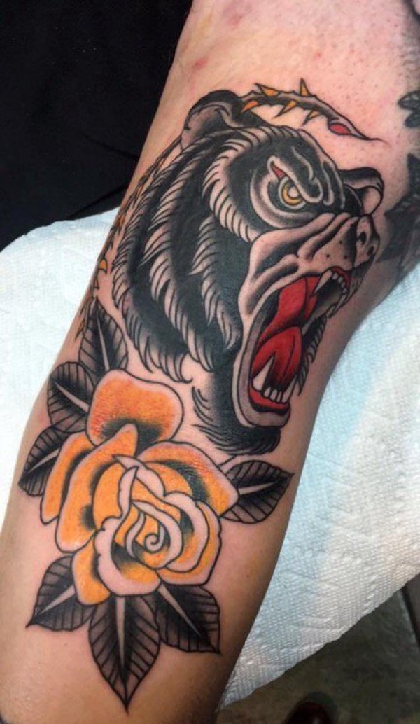 手臂上的传统风格黑熊和黄色玫瑰花纹身
