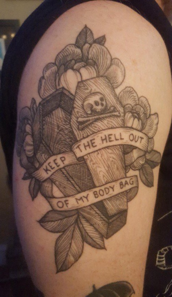 手大臂膀上的黑灰色英文横幅和骷髅头棺材纹身图片