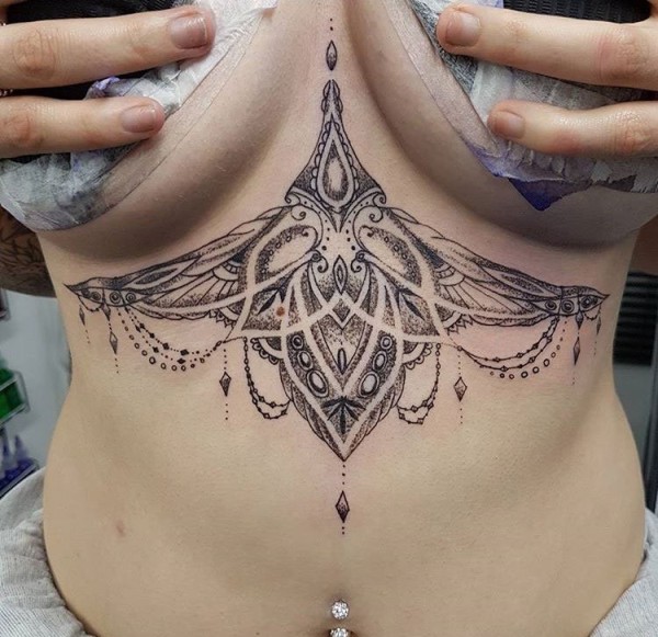 手臂上和胸骨上黑色几何点刺纹身曼陀罗纹身装饰画图案