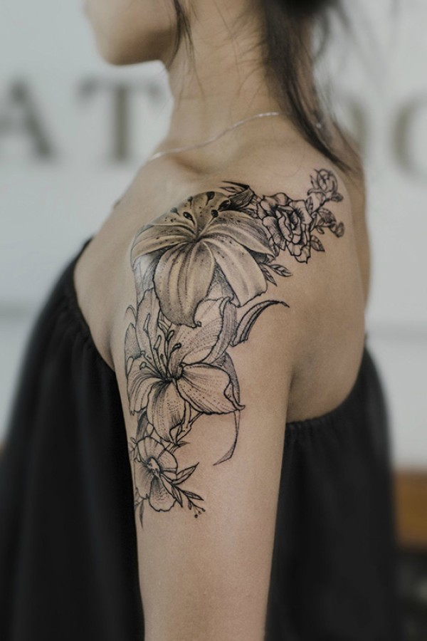 女性肩膀上多款漂亮的花朵纹身图案