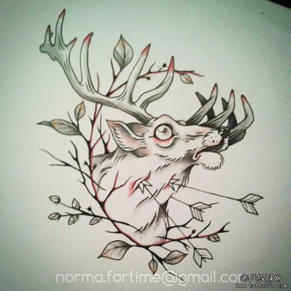 欧美麋鹿树叶纹身图案手稿