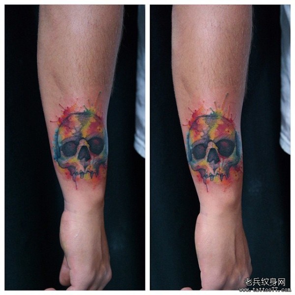 小臂泼墨骷髅彩色纹身图案