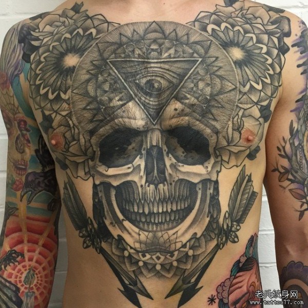胸部骷髅上帝之眼纹身图案