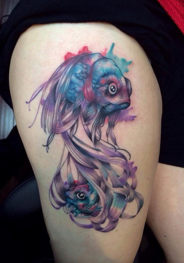 大腿水彩金鱼个性纹身图案