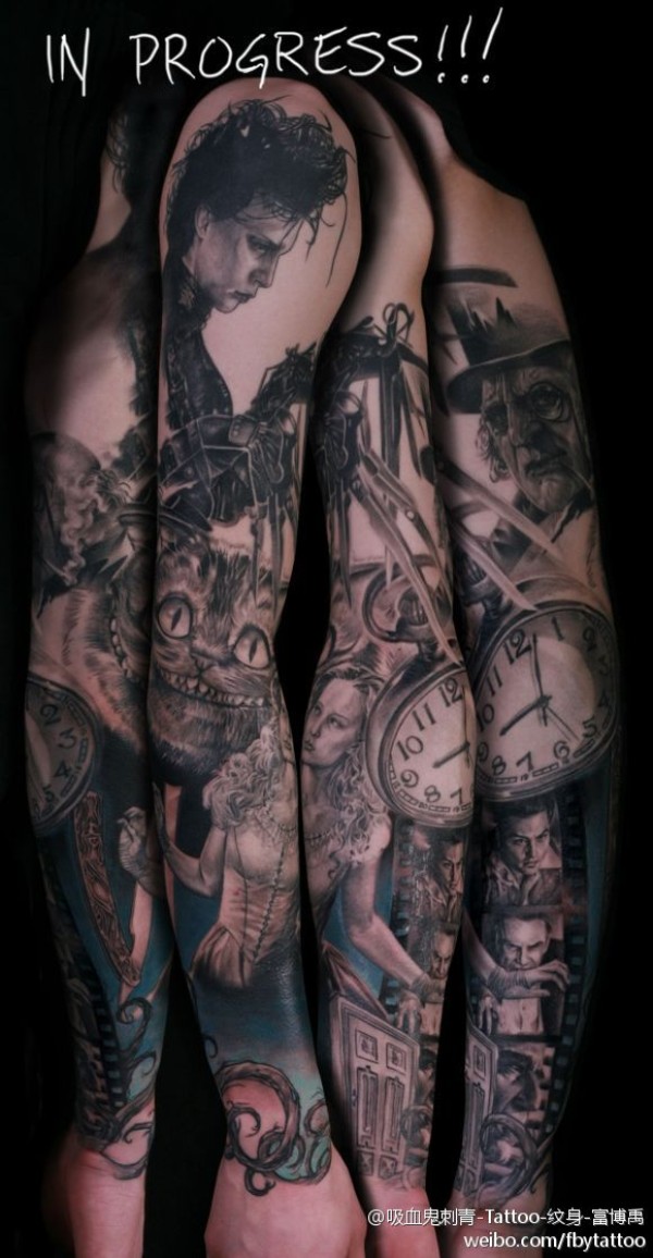 欧美花臂纹身_22张霸气黑灰欧美大黑花臂纹身图案作品图片