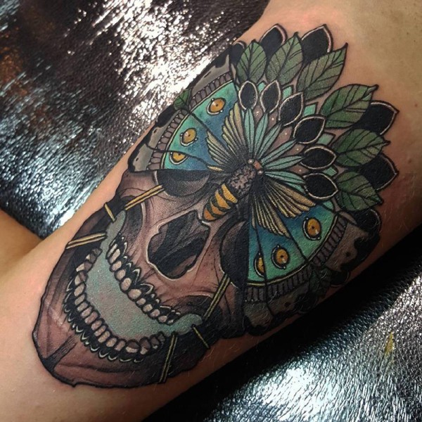 腿部oldschool蝴蝶骷髅彩绘纹身图案