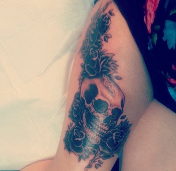 女性性感大腿上的黑色玫瑰花朵和骷髅头纹身