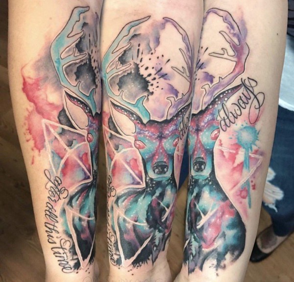 手臂上彩色梅花鹿头纹身星空纹身图片