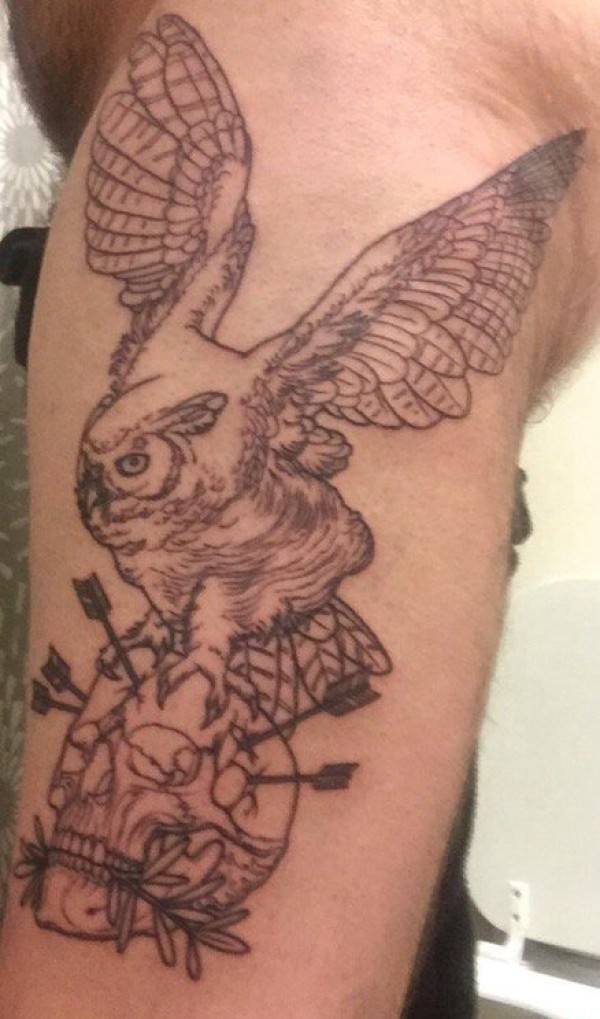 手臂上的黑灰色猫头鹰抓着箭刺骷髅头图案纹身