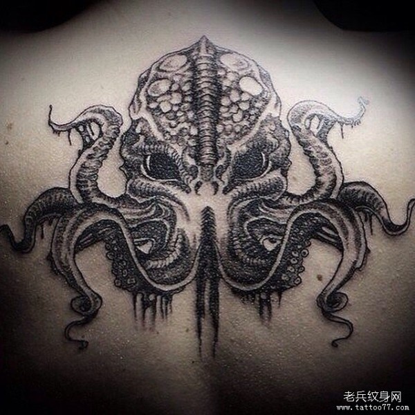 背部school章鱼黑灰纹身图案