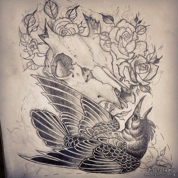 欧美羊头乌鸦玫瑰花纹身图案手稿