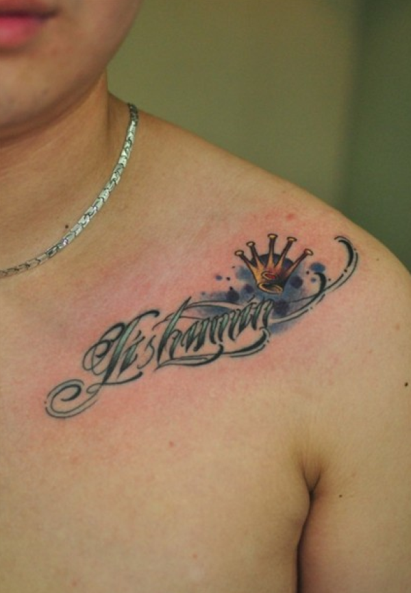 男人肩部处精美时尚的字母与皇冠纹身图案