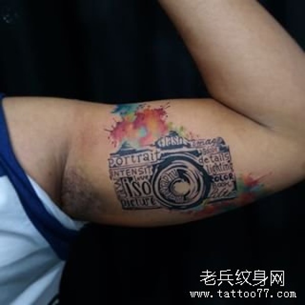 大臂相机泼墨彩色纹身图案