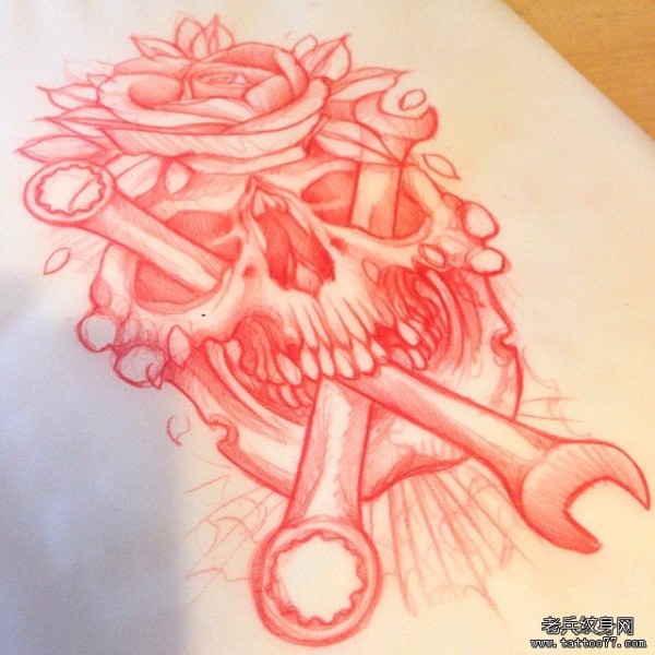 欧美骷髅花卉扳手纹身图案手稿