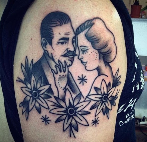 男人大臂黑白彼岸花骷髅_黑白纹身图案大全_纹身图吧