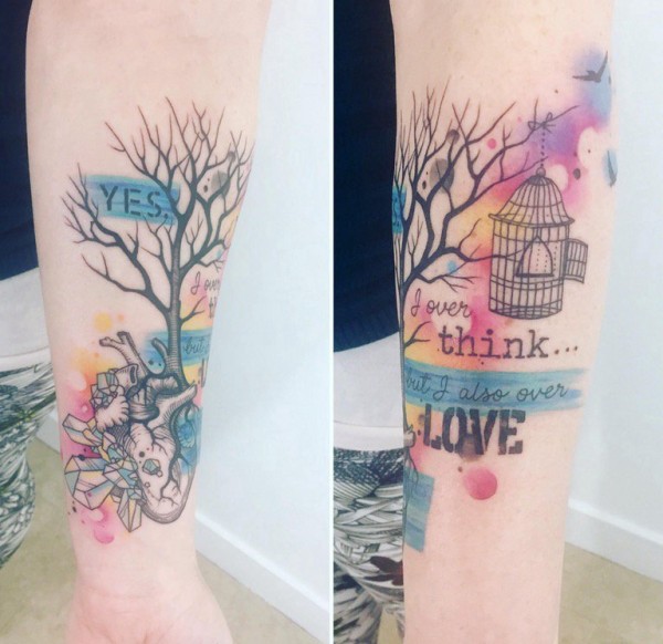 手臂彩绘纹身小树和机械心脏纹身花体英文字纹身图案