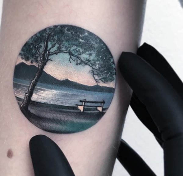 手臂上彩色纹身圆形图案风景纹身图案