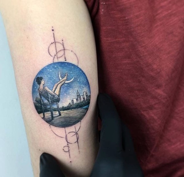 手臂上彩色纹身圆形图案风景纹身图案