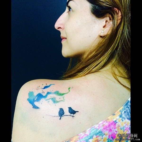 肩部泼墨小鸟小清新纹身图案