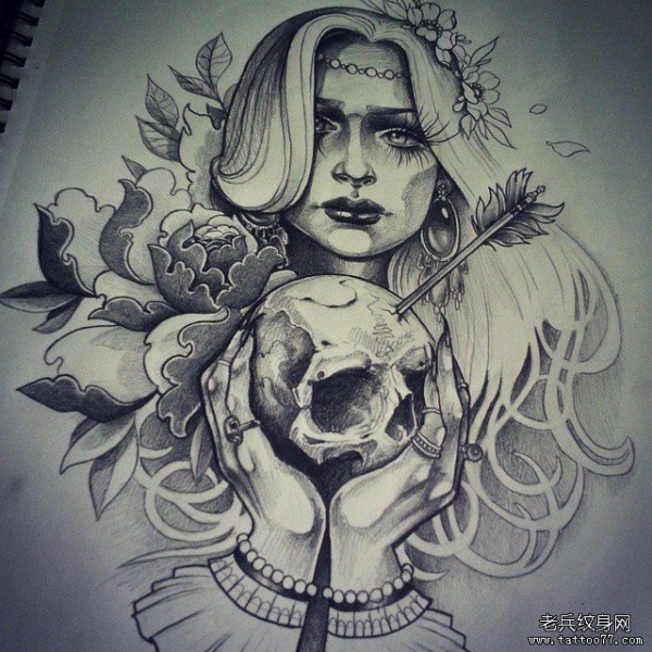 欧美女郎school骷髅纹身图案手稿