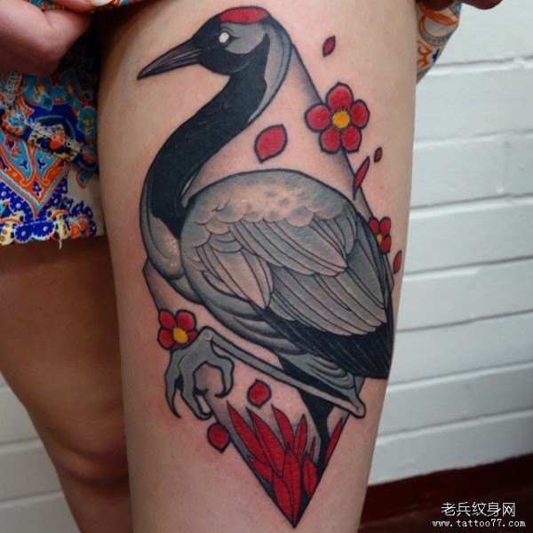 大腿传统仙鹤樱花纹身图案