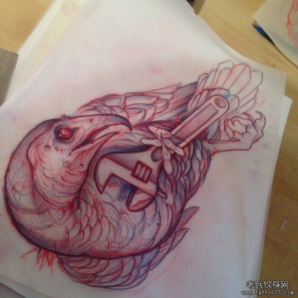 欧美school鸟扳手纹身图案手稿